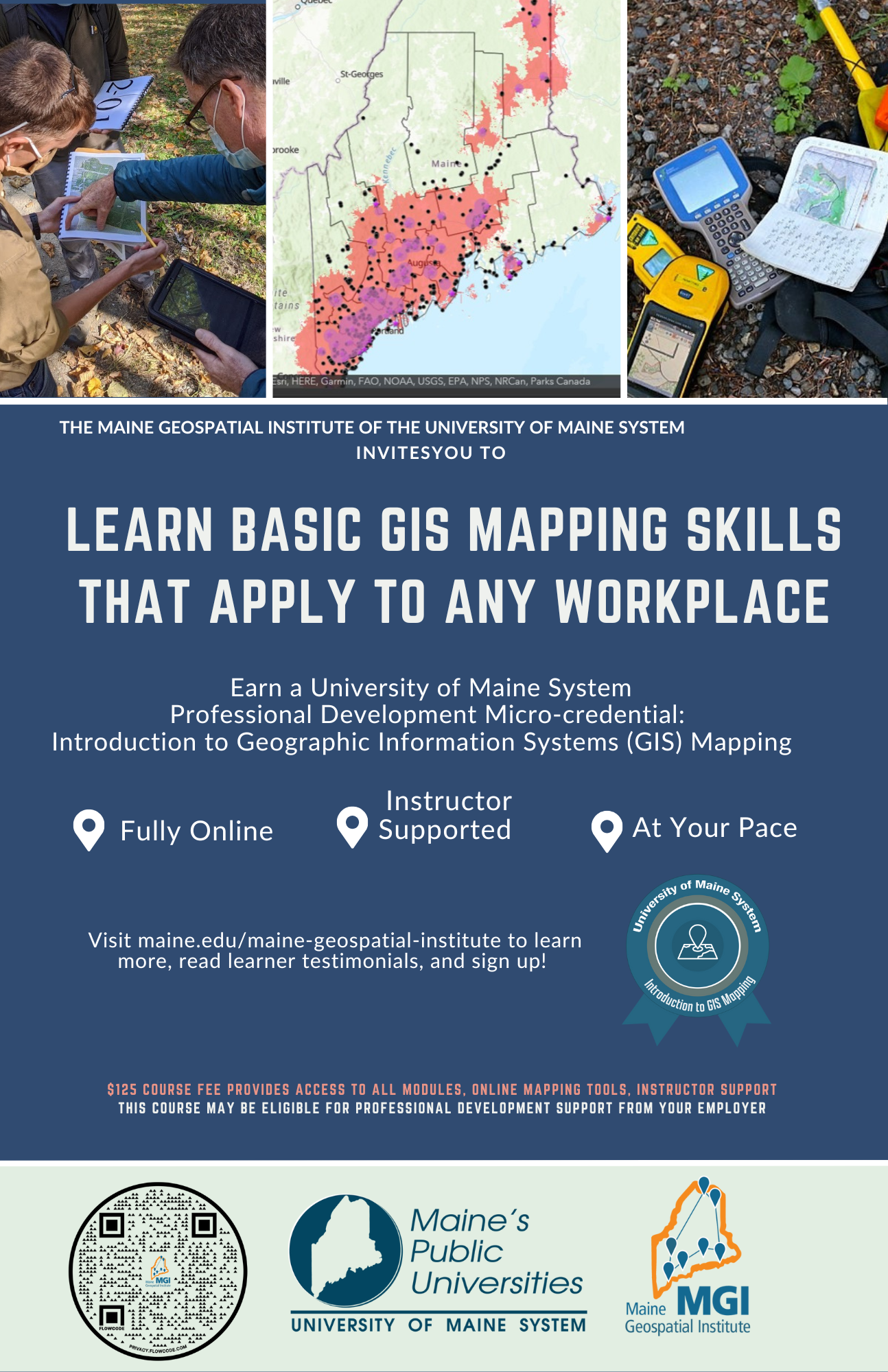 Apply online instruction to “real-world” problems while gaining valuable Geographic Information Systems (GIS) skills! The Maine Geospatial Institute, in collaboration with the University of Maine System Micro-Credential Initiative, is offering this professional development opportunity to learners from any discipline who would like to understand cutting-edge technology and tools – and use them, too! No prior GIS experience is required.