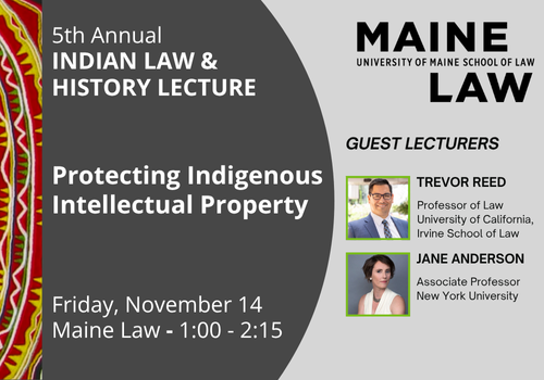 Join the University of Maine School of Law for its 5th Annual Indian Law and History Lecture. This year’s lecture, “Protecting Indigenous Intellectual Property,” will feature a discussion with Professor Trevor Reed and Dr. Jane Anderson. The event is open to all and will be held in a hybrid format, with options to attend in person at the Maine Center in Portland (300 Fore Street) or virtually via Zoom. Please Note: Registration is required.